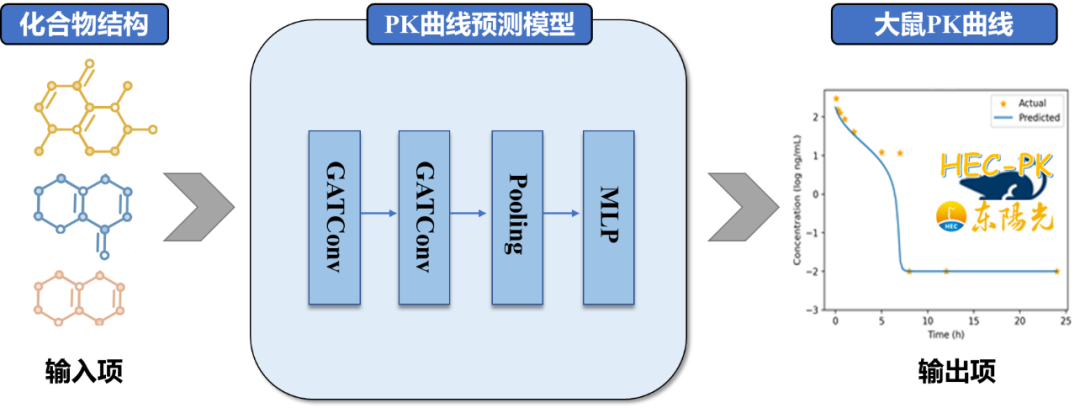 目前,基于药物静脉注射途径(IV)数据进行数据去重、整理后,得到1383条数据,并按照8:2比例划分为训练集和测试集,其中训练集用来训练,测试集用于检测模型性能。HEC-PK模型视小分子化合物为图(Graph), 以图神经网络(GNN)为基础模块提取分子图中的特征信息,可用于预测药物的大鼠PK曲线。模型筛选以GATConv作为消息传递层;组合使用WeightAndSum Pooling + MaxPooling作为池化层。当前HEC-PK模型深度为2层,采用2层GATConv进行消息传递,并进行池化提取整图信息,经MLP层预测小分子化合物的PK曲线。HEC-PK模型结构如图所示:
